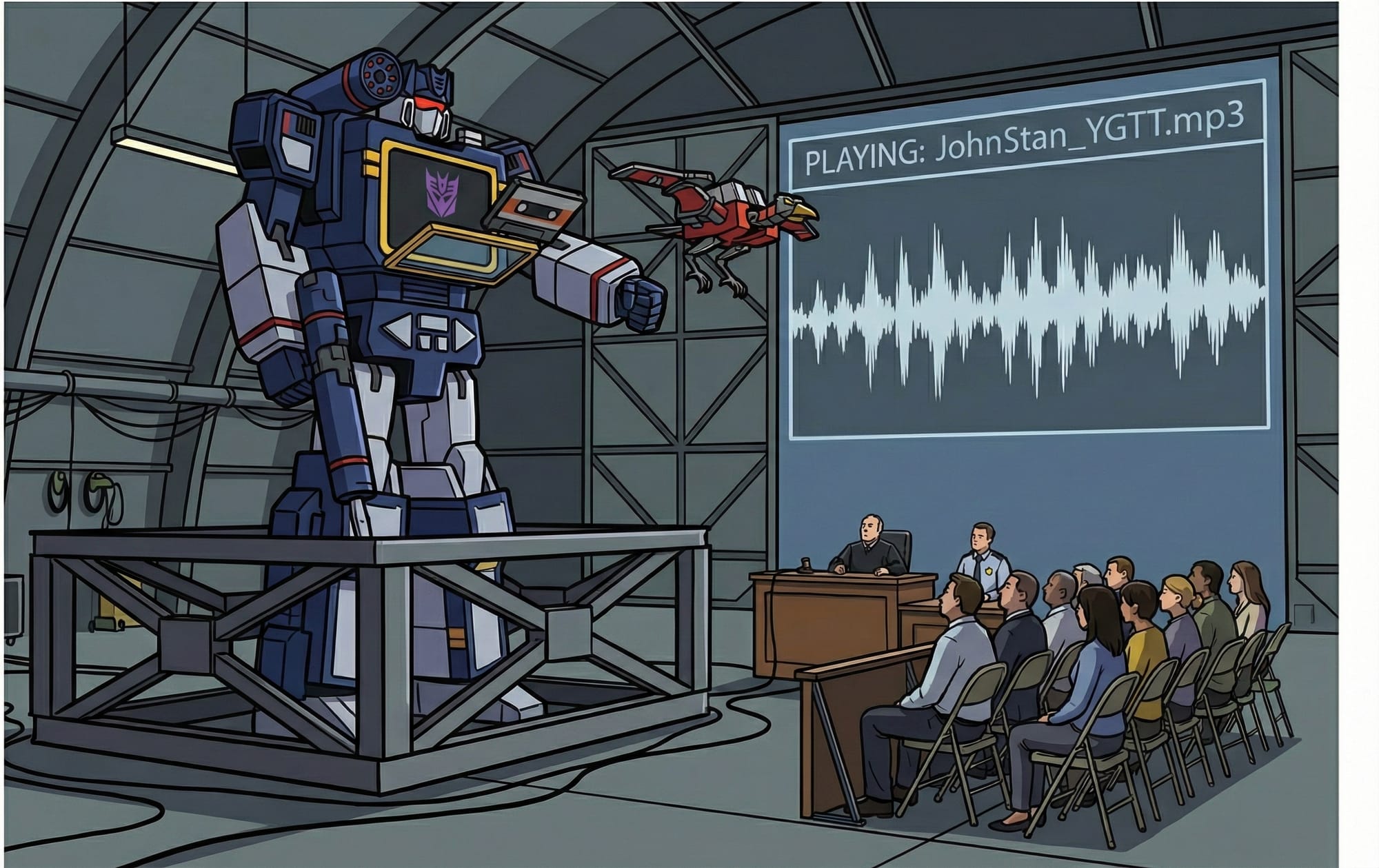 After weeks of testimony, a jury found Soundwave liable for surreptitiously recording private conversations without consent, a felony under the state’s stringent wiretapping laws. The courtroom, a converted aircraft hangar necessary to accommodate the two-story-tall defendant, echoed with the hum of cooling fans as the verdict was read. Soundwave received the news stoically, standing in a reinforced dock that had been hurriedly welded together by the Army Corps of Engineers.